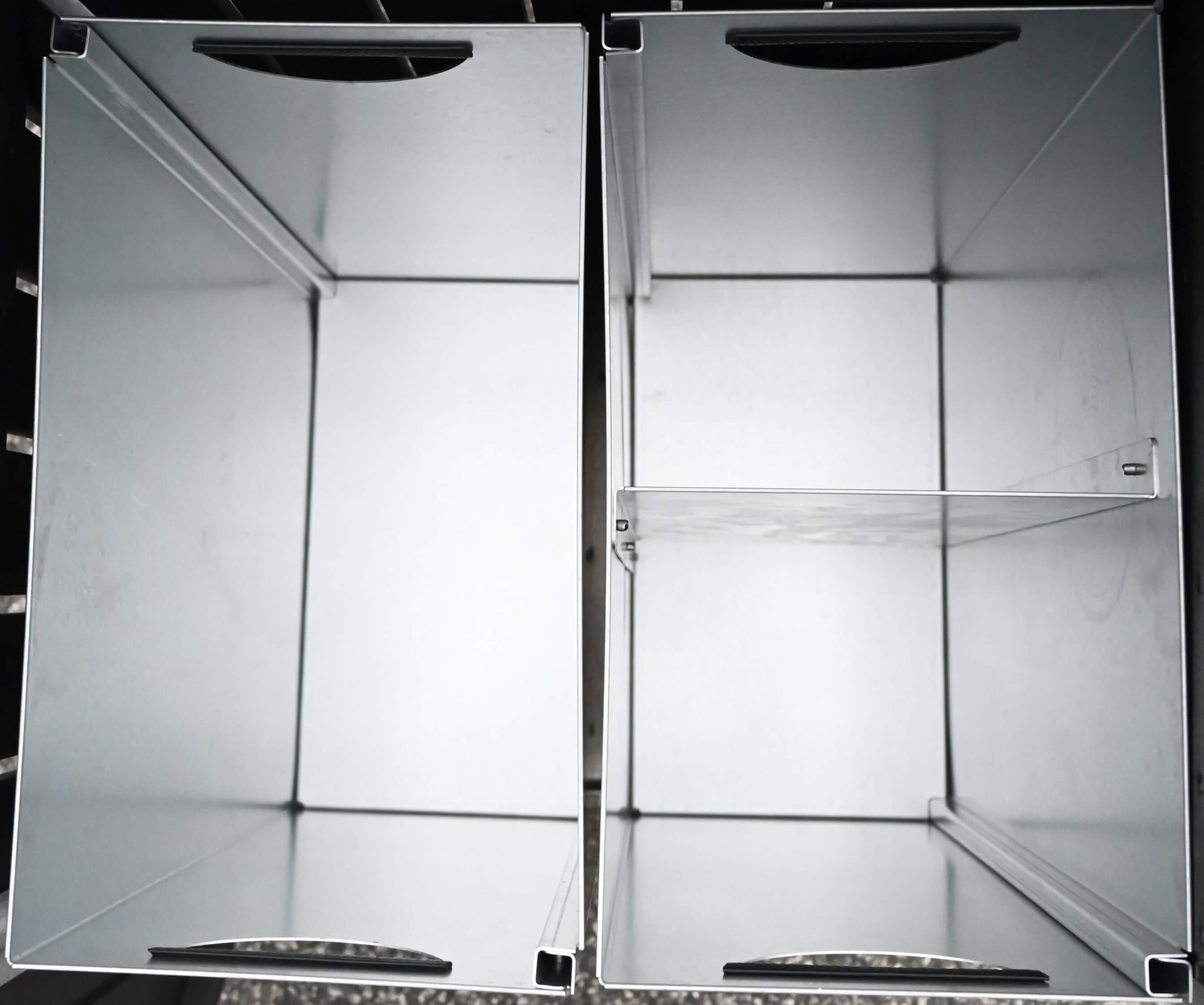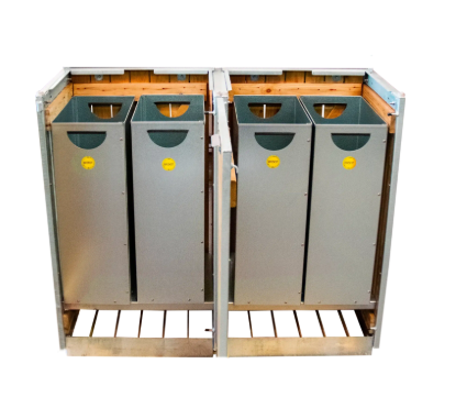De solide dobbelt miljøstativer kan sammensættes efter behov og fås med op til 8 rum. Du kan vælge mellem enkelt- eller dobbelt sækkering, og ved et dobbelt stativ kan du konfigurere med maks. 8 rum eller en kombination af 4 rum og sækkering.